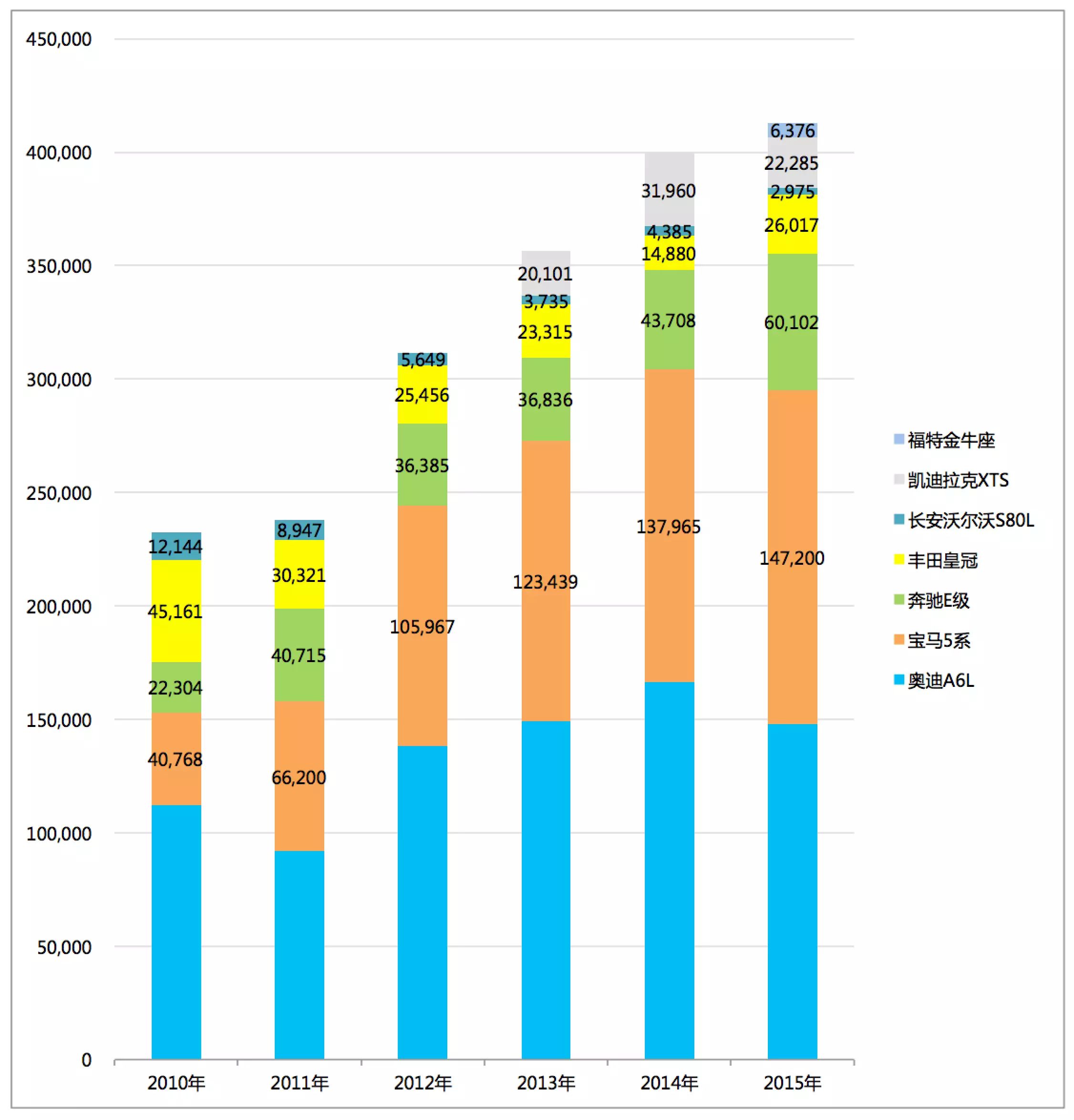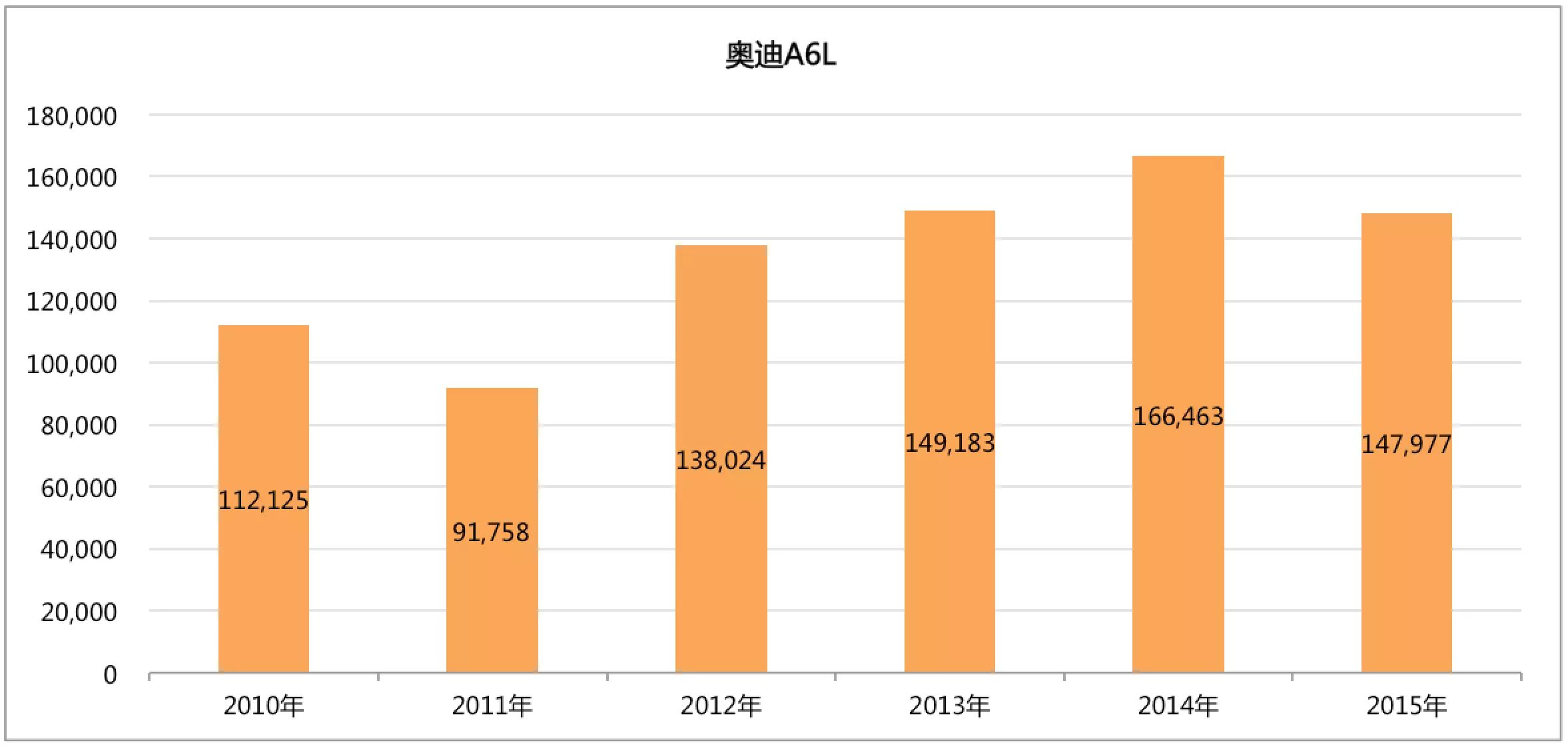 从2010年开始C级车市场的王者宝座一直被奥迪A6L所占据,从2010年的绝对霸主,占据到整个市场的份额超过了50%,而到了2015年奥迪A6L这一中国车市的常胜将军被宝马5系追近,只领先777台,还不足千台的差距显然让奥迪整个品牌感到了前所未有的危机。另一个值得惋惜的车型是沃尔沃S80L,这一以安全著称的品牌,在最辉煌的2010年销量超过12000台,而到了2015年全年销量不足3000台,这是何等的落差。