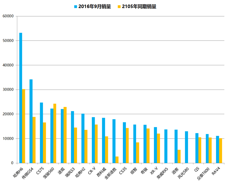 SUV销量前20与2015年同期对比