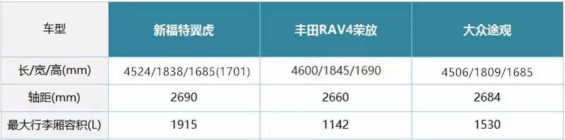 外观尺寸上RAV4荣放则是有着全方位的优势,看起来美系车竟然在车身尺寸上栽了跟头。不过,拥有3款中最长轴距的新翼虎不仅在乘坐空间上有保障,在最大1915L后备箱储存空间也是完胜竞争对手。