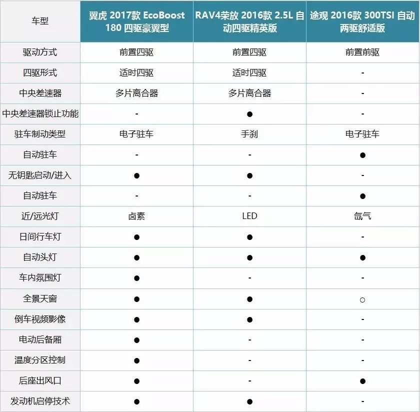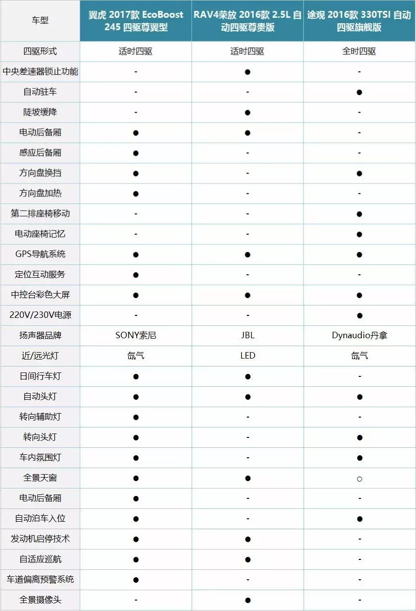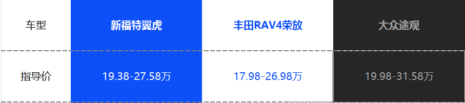 为了更好的找出新翼虎的“主角光环”,我们就从价格、尺寸、动力以及配置层面,对新翼虎和其最有力的竞争对手:丰田RAV4荣放(日系代表)、大众途观(德系代表)进行一番全方位的对比。我知道有人要说新上市的标致4008怎么不拿出来对比一下,虽说4008刚刚上市,产品竞争力十足,但从法系整体的外观设计和操作体验上来讲,还是存在着让人爱憎分明的特征的(法系车偏向于个人情结),就不在此做对比了。