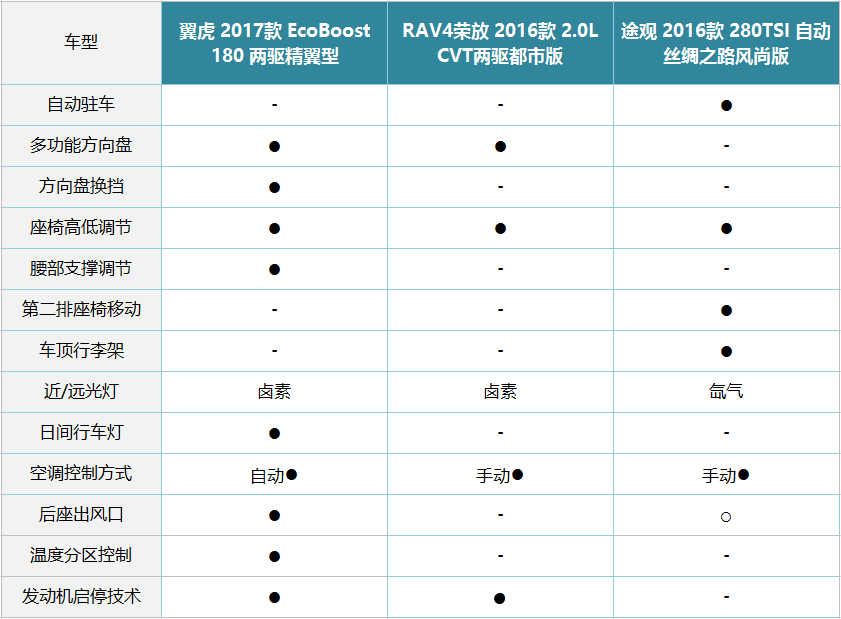 就三款车的入门车型而言,新翼虎还是有着很大优势的,不仅是相较于竞品,就算是豪华品牌,在入门车型上就搭载自动分区空调并带有后出风口的车型都实属罕见,全系标配的18寸轮毂、日间行车灯、和带换挡拨片的多功能方向盘也令新翼虎增色不少。而作为今年补充版新发布的途观入门车型,则在氙气大灯和座椅空间利用率上下了一番功夫,当然自动驻车功能也是在同级别车型中比较少见的。