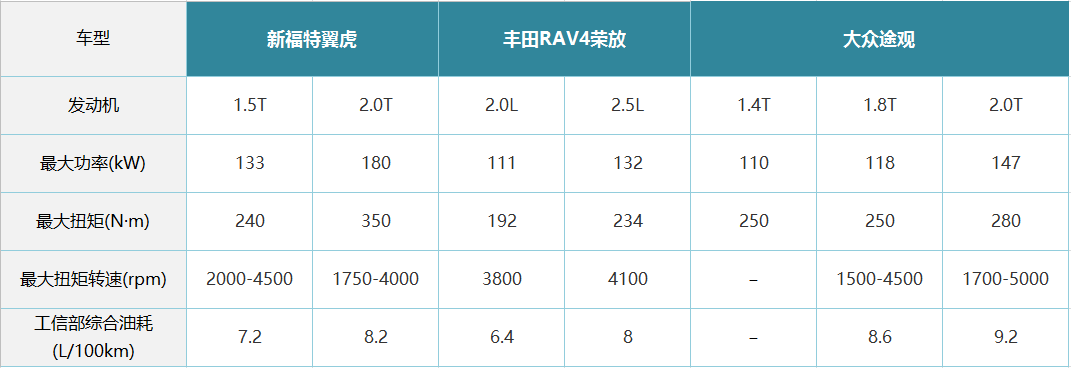 如果单看动力参数,新翼虎采用的EcoBoost发动机不管是在小排量还是大排量上都有很大优势。福特在发动机的研发与调校上,甚至是不输豪华品牌的。不过,不可否认的是,新翼虎的1.5T车型尽管在峰值功率上略高,但决定动力输出的峰值扭矩却稍逊于途观的1.4T,而且最大扭矩转速区间2000rpm起步也让1.5T的新翼虎在城市道路上难以发挥真正实力。另外,采用自然吸气的RAV4荣放有着三车中最大的排量,却拥有最低的油耗数据,这倒是把日系车省油的特点体现的淋漓尽致。