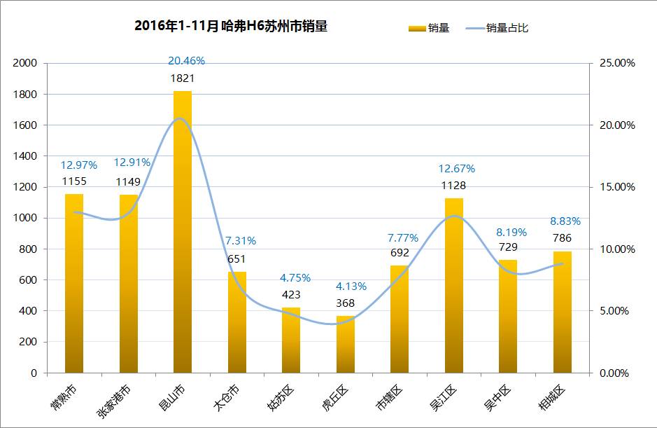 2016年前11个月,常熟市、张家港市、昆山市、太仓市等4个苏州代管市哈弗H6分别销售1155辆、1149辆、1821辆、651辆,分别占苏州市总销量的13%、13%、20%、7%。2016年前11个月,常熟市等4个代管市销售4776辆哈弗H6,占苏州市销量比重高达53.65%。哈弗H6在苏州市的销量显然主要以常熟市等经济发达的县级市作为支撑。