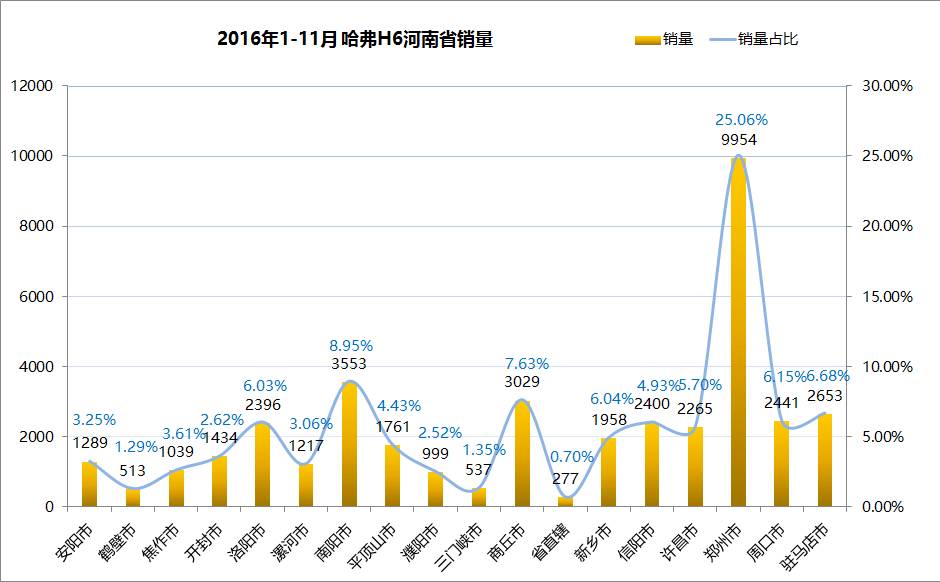 如果从地市级的角度来分析哈弗H6销量,江苏、河南两省最具代表性。江苏、河南是2016年前11个月哈弗H6销量最大的两个省份,分别销售41416辆、39715辆。在江苏省内部,苏州在省内销售占比最高,同期销量为8902辆,占全省销量21%。此外,南京、南通、无锡三地在哈弗H6全省销售份额中占比也均超过了10%,分别达到了10.5%、11.21%、12.83%。由于各地经济发展相对均衡,哈弗H6在江苏省销售格局有点类似山东,省城销量比重不大。哈弗H6在河南省销售情况则明显表现出省城独大的格局。2016年前11个月,郑州市销售9954辆,占全省销量的25.06%。除省城郑州外,河南省没有任何一个地市级区域销量能够达到10%。