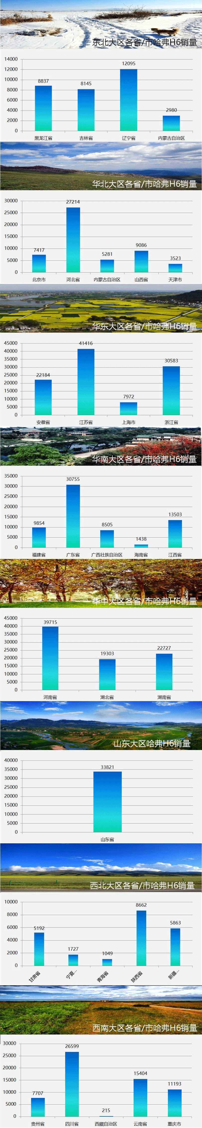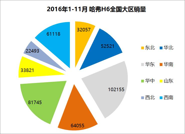 从区域销量来看,华东、华中、华南、西南、华北是H6最大市场