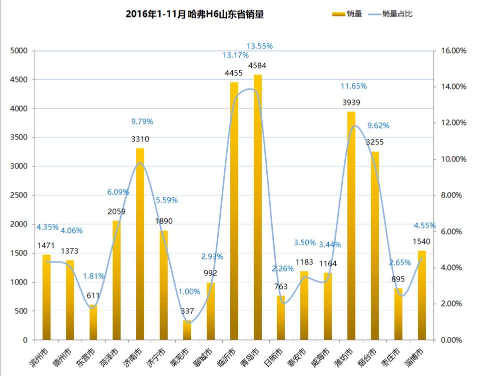 除河北、河南、江苏、广东、四川五省外,山东省也是一个重要的省份。在经济格局上,山东存在多个经济重心。这一点与常见的省城经济一家独大模式不同。从哈弗H6在山东省的销量情况来看,山东省内各地市销量差异极大。2016年前11个月,莱芜市销售哈弗H6总计337辆。同期,山东省哈弗H6销量最高的青岛市销售4584辆。两者销量差距超过13倍。哈弗H6在济南、青岛、潍坊、烟台销量较高。这4个区域是哈弗H6主力销售区域。同时,对照各市人口数量、GDP情况,哈弗H6在德州、聊城、枣庄、淄博的表现相对一般。这几个山东地市整体汽车销量相对较少。哈弗H6在这几个地市销售情况也还是不错的。