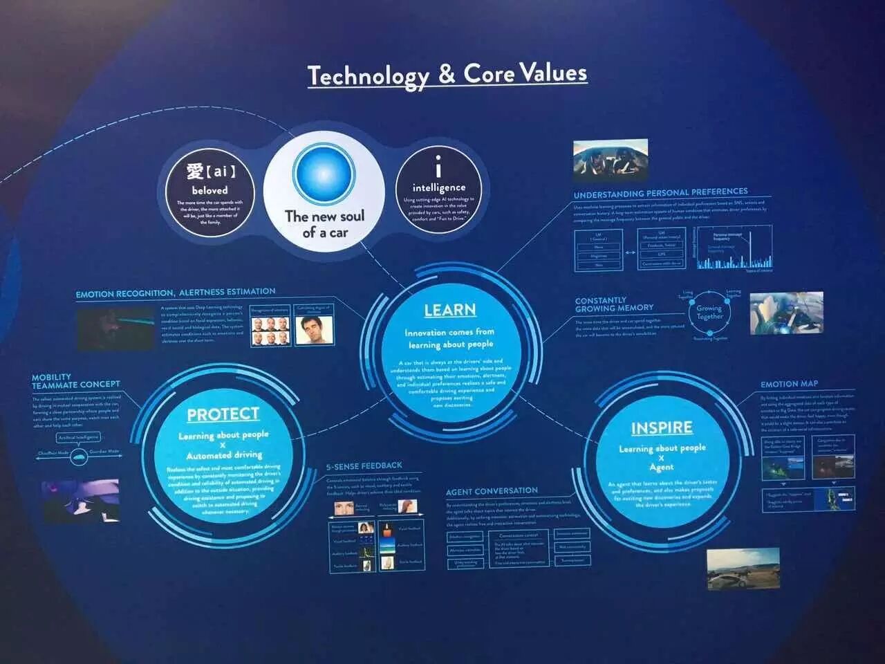丰田的智能之途绝非平步青云。如今的理念为“Home on wheels”(移动的家),丰田曾先后推出车联网系统ENTUNE 3.0 和提供给APP开发者的互联平台SMART DEVICE LINK;再向前追溯,是前装的车联网系统G-Book。从商业生态角度看来,丰田要有自己独立而集成的驾驶辅助系统(或产品),更要为布局未来自动和无人驾驶层级而打造雏形,要铺自己的路。这次发布的YUI(发音差不多是“友谊”)人工智能系统的诞生就合情合理了。