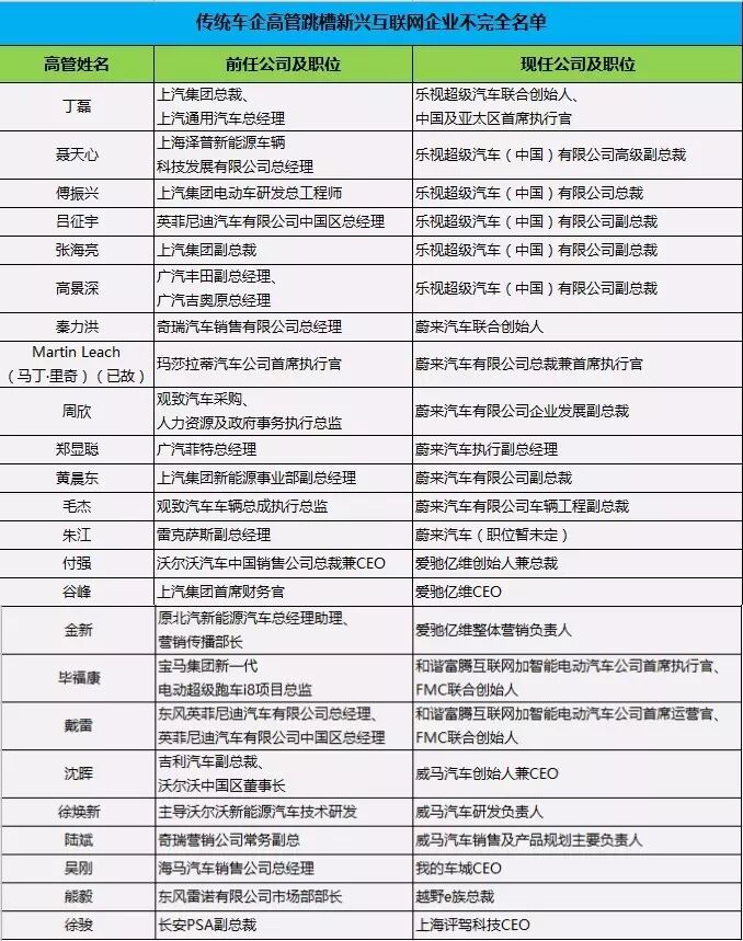 此外,还有更多攀爬至传统车企中高层的中坚人才,也为这份名单添彩:郑显聪、吕征宇、高景深、金新……他们告别了广汽菲克、英菲尼迪、广汽集团、北汽新能源等传统车企,投奔到乐视、蔚来汽车、爱驰亿维等新兴公司,想要将整个汽车产业链在一个二进制的世界里重新洗牌。