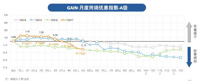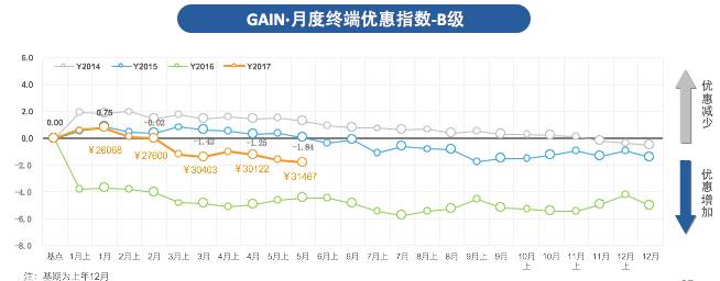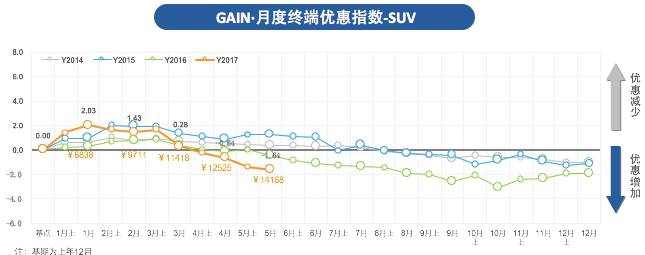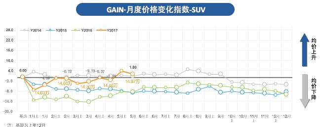 2017 GAIN·5月SUV价格变化指数为1.80,环比上升3.6%,市场均价从14.46万上升至14.97万;市场终端优惠指数为-1.64,环比下降11.1%。