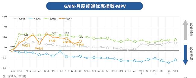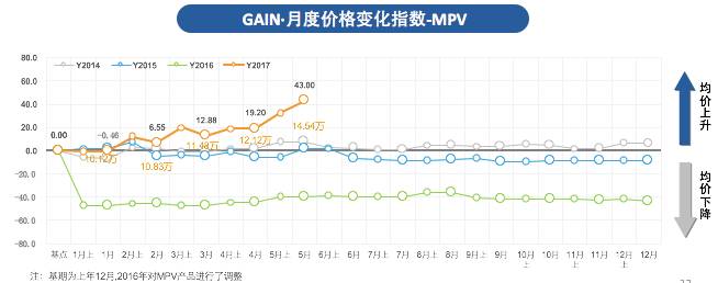 GAIN·5月MPV价格变化指数为43.00,环比上升20%,市场均价从12.12万增加至14.54万市场;其终端优惠指数为2.69,环比下降16.1%。