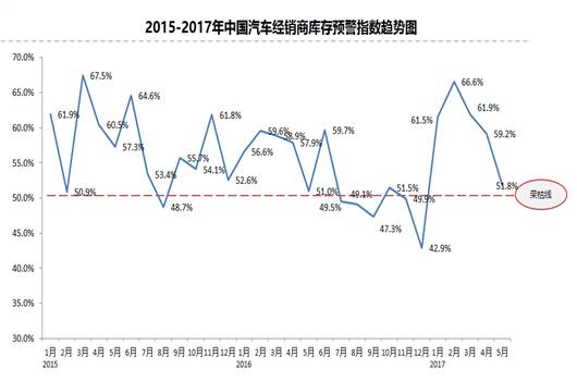 Index)显示,2017年5月库存预警指数为51.8%,比上月下降7.4个百分点,但是仍位于警戒线以上。