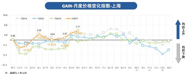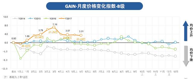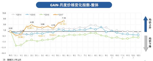 根据GAIN·指数对于5月份汽车市场的分析,成交价格变化指数同比、环比都直线上扬,2017年GAIN·5月整体价格变化指数为7.18,环比上升4.9%,市场均价从13.53万上升至14.19万,涨幅高达6600元。