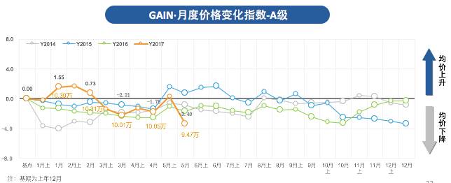 而主要战场集中于A级、B级车市场中。5月份,A级、B级的GAIN·价格变化指数均呈现下降趋势。