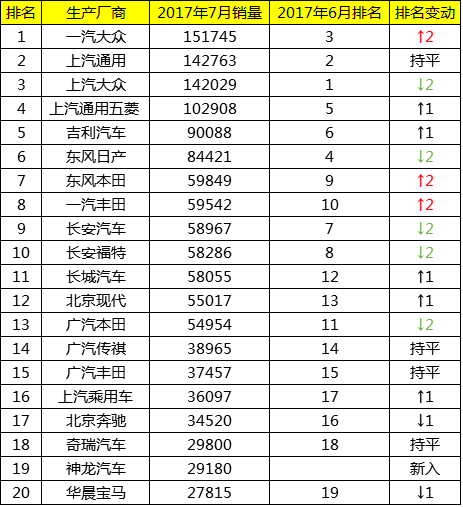 综合各媒体信息和乘联会数据显示,2017年7月中国汽车市场狭义乘用车销量167.4万辆,同比增长6.1%。从各大企业销量来看,各大车企销量排名变化较上月有所增大。同时,日系车企内部也出现分化态势。东风本田、一汽丰田等日系车企7月仍保持增长,但东风日产、广汽本田等企业则出现销量排名下滑。此外,一汽大众7月销售排名明显上升,较上月提升2个名次至月度销量冠军。