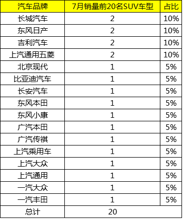在SUV车型方面,长城汽车、东风日产、吉利汽车、上汽通用五菱旗下车型仍然是进榜大户。7月,长城汽车、东风日产、吉利汽车、上汽通用五菱各有2款SUV产品进入月度销量前20强。与6月相比,吉利汽车进入SUV销量前20强的车型减少1款,仍保持2款车型进榜。此外,北京现代旗下也有1款车型进入月度SUV销量前20强。(健坤)