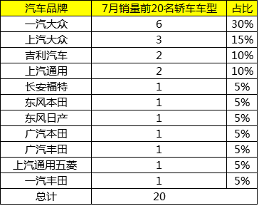 在汽车行业,爆款车对于企业销量至关重要。对于汽车企业而言,进入轿车、SUV等细分市场销量前20名车型越多代表其实力越强。在7月的销量前20强轿车产品中,大众车型继续保持强势。一汽大众、上汽大众7月分别进榜的车型数量为6款、3款。尽管轿车一直不是国产品牌的强项,但在7月我们也看到了变化。7月,吉利汽车进入7月销量前20强轿车产品有2款,较6月增加1款。此外,上汽通用五菱也有1款产品进入轿车销量前20强。至此,国产轿车进入7月轿车销量前20强。