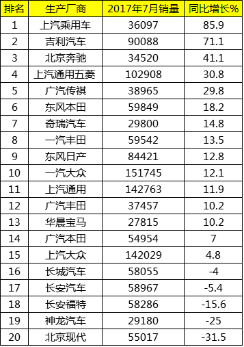 从销量绝对值来看,2017年7月中国汽车市场狭义乘用车销量前20名汽车企业仅有8家较6月销量有所增长。同时,销量前20名企业最低门槛也下降了2000多辆。从整体来看,多数汽车企业销量在淡季均有所下降。