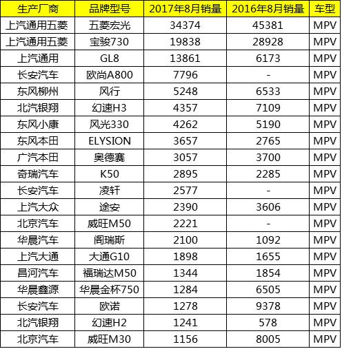 在国内细分市场,MPV领域变化最小,销量绝对值也较轿车、SUV产品有较大差距。8月,上汽通用五菱旗下的五菱宏光、宝骏730仍占据了MPV市场的冠亚军地位。8月,上汽通用五菱五菱宏光、宝骏730分别销售34374辆、19838辆。