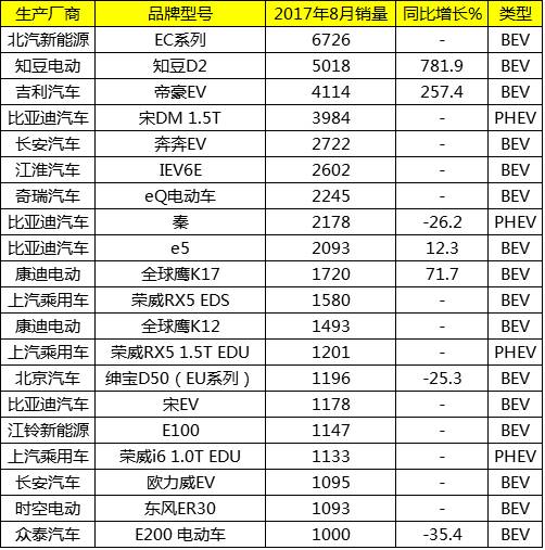 新能源车型8月排名变化剧烈
