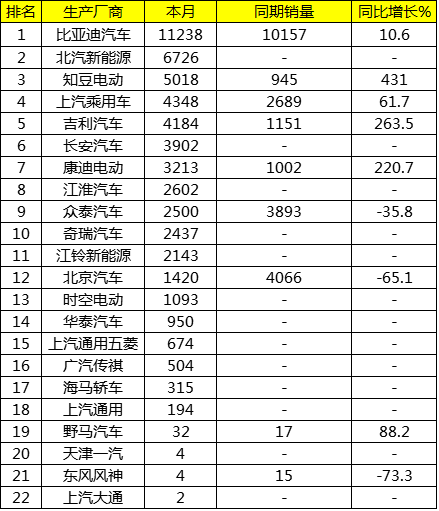 除比亚迪外,北汽新能源、知豆汽车、上汽乘用车都在新能源领域颇有建树。8月,北汽新能源、知豆电动、上汽乘用车分别销售新能源狭义乘用车6726辆、5018辆、4348辆。从排名变化来看,上汽乘用车与知豆汽车排名发生了对调。8月,知豆汽车销售5018辆,销量较上汽乘用车领先约700辆。