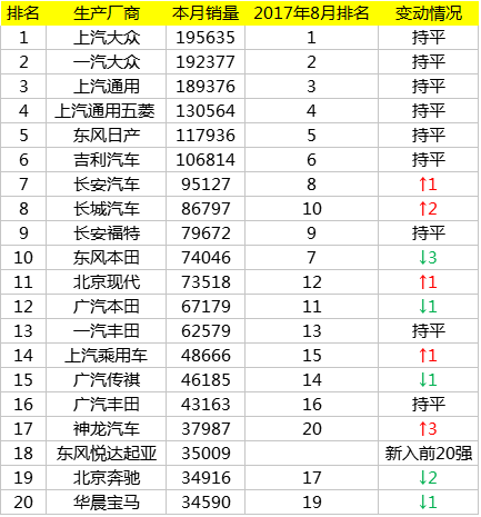 在以往的月度车企排名分析中,我们将国内前20名车企业划分为四大阵营。第一阵营月均销量集中在15万辆以上,主要包括上汽大众、一汽大众、上汽通用。第二阵营车企主要集中在月销10万辆左右,上汽通用五菱、东风日产、吉利汽车。从9月的数据来看,第一、二阵营排名稳定,排名顺序完全与8月相同。