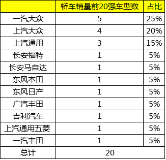 从销量前20名的轿车车型所属车企来看,大众品牌在9月仍然拥有最多车型入榜。不同的是,上汽大众、一汽大众入榜的车型分别为5款、4款,总数由上月的10款下降至9款。在新入榜方面,长安马自达旗下的马自达3 Axela成为新入榜的车型。