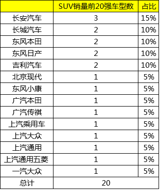 与轿车市场一家独大不同,SUV市场则更加分散。从销量前20名的SUV车型所属车企来看,长安汽车、长城汽车、东风本田、东风日产、吉利汽车均在SUV市场有较强实力。9月,长安汽车、长城汽车、东风本田、东风日产、吉利汽车进入销量前20名的SUV车型分别为3款、2款、2款、2款、2款。在变化方面,长城汽车在8月成功发力,2款SUV进入销量前20名。(健坤)