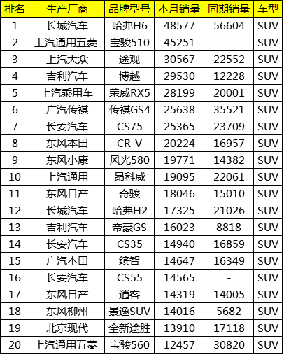 国内SUV在10月市场变化较小。从入榜的前20强车型名单来看,10月入榜SUV销量前20强与9月仅有1个名单差异。此外,10月SUV排名前3位车型也与9月完全相同。