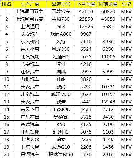 国内MPV市场排名变化一直较小。10月,五菱宏光、宝骏730分别销售42010辆、22850辆,仍分居MPV市场月度销售冠亚军。此外,欧尚A800、风光330也有较好表现。10月,欧尚A800销售9967辆,排名由9月第5上升至第4;风光330销售6524辆,排名尽管较上月下降1位,但销量均9月增长近2000辆。
