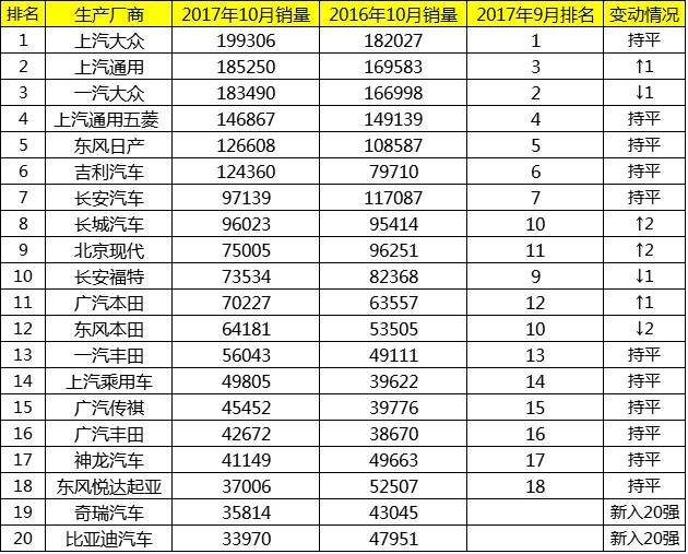 综合各媒体报道及乘联会信息,2017年10月中国汽车市场狭义乘用车销量224.9万辆,同比增长2.6%。从10月的数据来看,北京现代、长城汽车10月表现较好,排名都有2个位次的上升。同时,上汽通用五菱、东风日产、吉利汽车销量出现普涨,较9月销量均增加了1万辆以上。