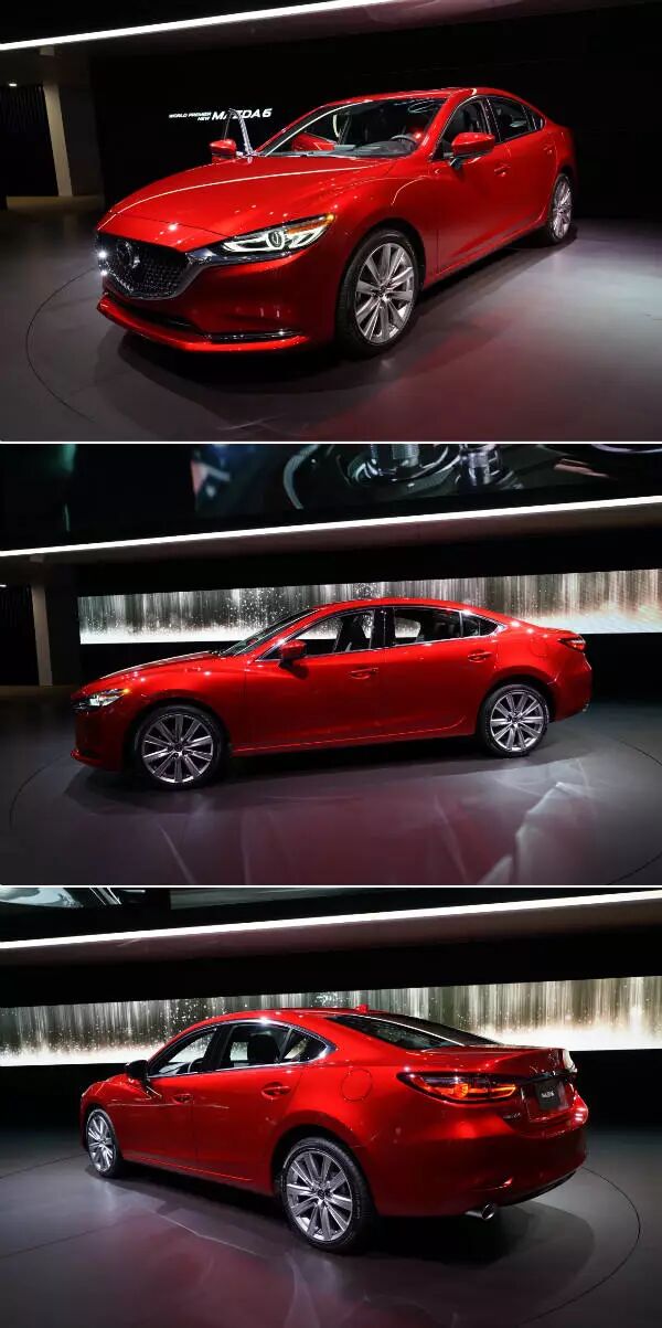 洛杉矶车展上发布的新款马自达6即国内市场将要改款的阿特兹车型,外观设计变化在于加入格栅点阵设计,大灯组造型更加狭长和犀利。与现款车型最大改变则在于其增加了一款2.5T涡轮增压引擎,而招牌的创驰蓝天自吸发动机则能够实现直喷及自动切换双/四汽缸模式。
