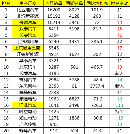 从今年各月销量数据来看,销量5000辆以上,排名前10的新能源企业销量波动变化相对较少。但12月份的数据却打破了这个惯例。奇瑞汽车、众泰汽车、长安汽车12月分别销售10214辆、6411辆、6354辆,排名分别上升4位、5位、6位。与之对应的是,吉利汽车销售2984辆,排名较上月下降4位至第12;江淮汽车销售1841辆,排名降低13位至16;知豆电动销售1271辆,排名下降13位至第18。