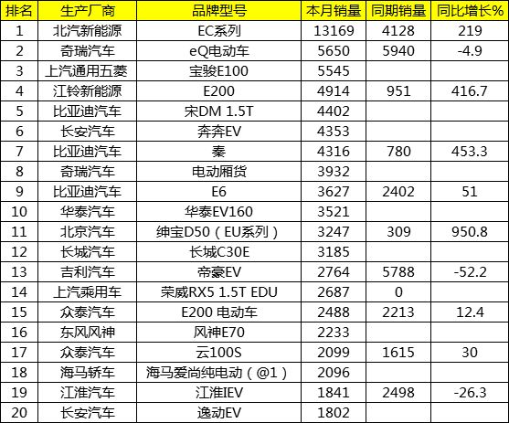 除EC系列外,eQ电动车、宝骏E100则是12月仅有的销量超过5000辆以上的车型。12月,eQ电动车、宝骏E100分别销售5650辆、5545辆,分别较上月劲升2278辆、3630辆。因此,正是受益于eQ电动车、宝骏E100的突然放量,奇瑞汽车、上汽通用五菱在本月排名出现明显上升。