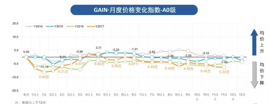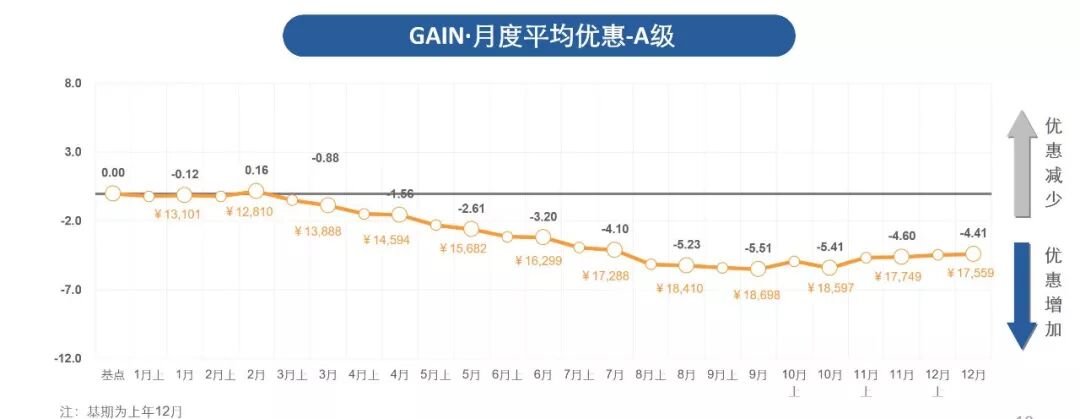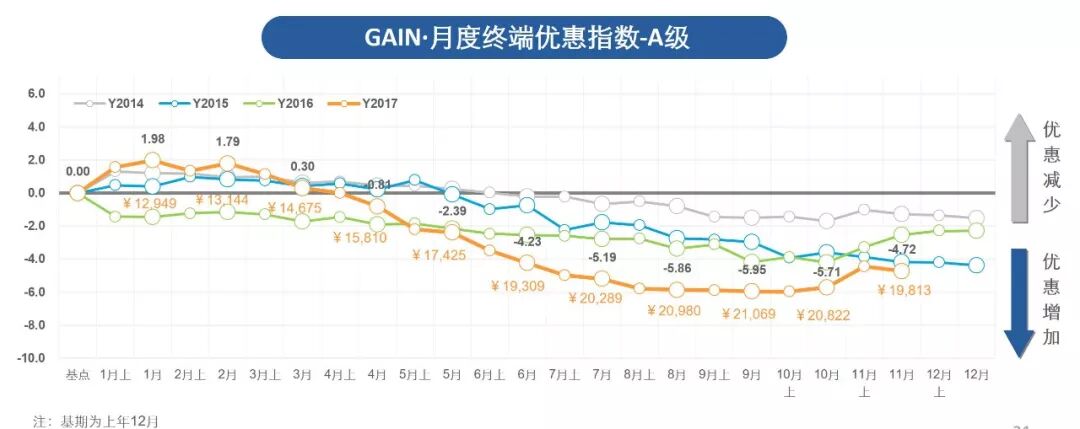 甚至到了12月份,成交价格呈现小幅上涨的趋势。根据2017 GAIN·12月A级别平均优惠指数为-4.41,环比上升1.1%,A级市场的整体终端优惠仍然呈现小幅收窄的走势。