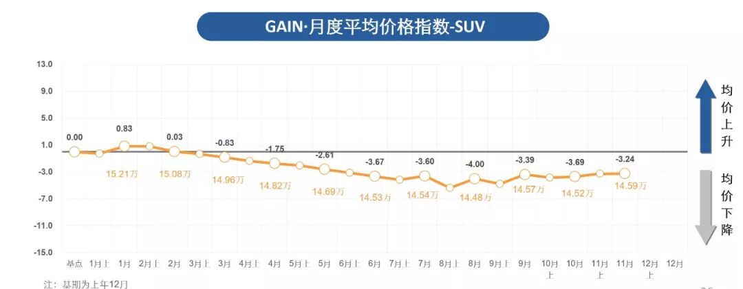 在去掉权重比例的计算中,2017 GAIN·11月SUV平均价格指数为-3.24,环比上升0.5%,市场均价从14.52万上升至14.59万,降幅700元。