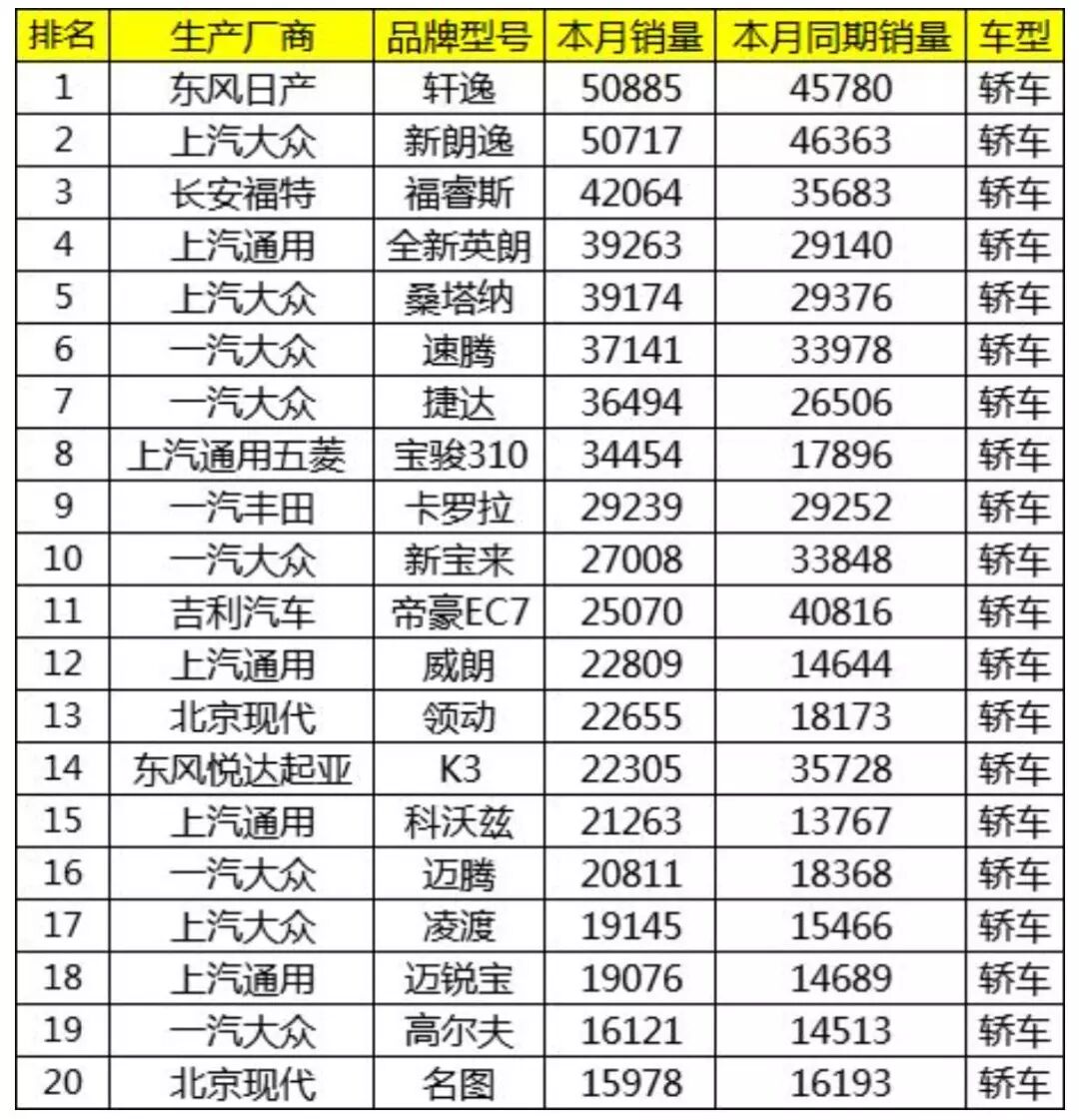 另一边厢,吉利新帝豪EC7则稳稳把住2万辆区间,不断在前十排行榜中向更前探进。同时A级车的“三雄”新朗逸、新英朗和轩逸则继续着排头兵的轮换,并一步步把销量的天花板不断向上抬,冲破了月销量5万辆的大关。