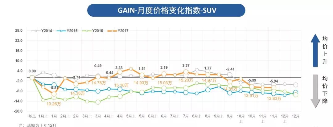 而加权计算后,2017 GAIN·11月SUV市场价格变化指数为-5.94,环比下降0.6%,市场均价从13.91万下降至13.83万。截至11月,SUV市场整体终端成交价格已经连续4个月下降,本月降幅为800元。