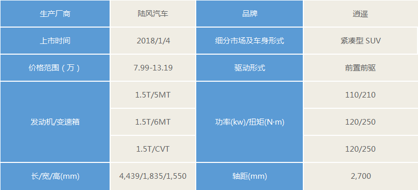陆风逍遥定位于跨界型SUV,但整体来看逍遥依然偏向于SUV外观,侧面看起来也同GLA有几分神似。为了保持SUV固有的良好通过性又能够使车身看起来富有良好曲线,逍遥在头部空间方面稍显劣势。内饰造型方面,标配的三幅多功能方向盘结合红黑配色,使新车拥有不属于外观的运动气息。基于陆风全新平台打造,逍遥也几乎代表了陆风近年所积攒下的造车工艺顶峰,尽管和X7长度接近,但整体重量轻了近200kg。总之,作为与君马S70同期的肩负起改变品牌形象的车型,逍遥之于陆风的改变看起来是要更大一些,而在同级SUV多以实用为主的市场竞争中,年轻运动的设计表现或许会让逍遥在市场中有着出人意料的表现。