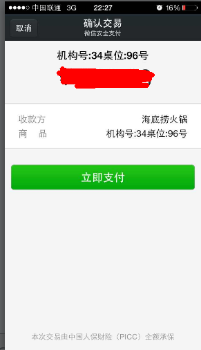 海底捞微信支付店内结账餐饮o2o二维码美食 |