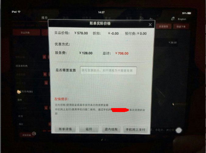 先说说这个微信支付和海底捞到底是咋结合的,点菜涮锅咱就略去了,重点说说这个支付流程吧,首先结账的时候服务员拿来的不是小票而是iPad(海底捞在餐饮信息化建设上一直走得很超前)。