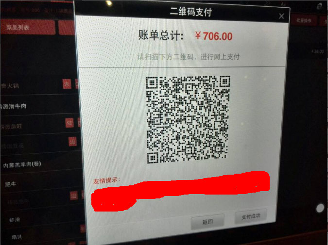 可 能有人会说我们家餐馆没海底捞那么高大上,没有用iPad点菜的怎么办?其实海底捞也不是每家店都有iPad的,而且万一iPad罢工了咋办?我也趁机打 探了下,竟然已经有解决方案,而且跟我以前的设想完全一样……就是用小票打印机打二维码结账!不过由于打印清晰度问题,有些手机不一定能扫出来,但是 iphone基本无压力。