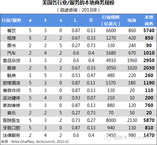 一个理解本地商务将在多大程度上被互联网侵蚀的指标是“本地系数”(local coefficient)。本地系数(用字母“L”表示)定义每一种产品或服务的本地化程度,用0到1来衡量;每种产品或服务都可以用0到1之间的数字来 代表它们的本地系数,系数越高说明该行业或服务的本地化程度越高,比如书籍是0.2,餐饮是0.9,服装是0.6。这个系数可以根据自己的直觉判断,为使 评判更为直观准确,Mike Ghaffary把本地系数分解为三个部分。