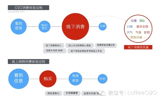 O2O的流程是:消费者在线上得知信息,产生购买/预订,到线下消费,然后在线上给出反馈(也可能不给)。和普通线上购物过程相比,差别如下图。