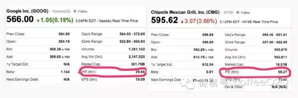 主流股票市场中的平均市盈率为15。Google的市盈率为30。Chipotle的市盈率为56。换而言之:Chipotle的利润比Google的更加值钱。实在是难以置信。