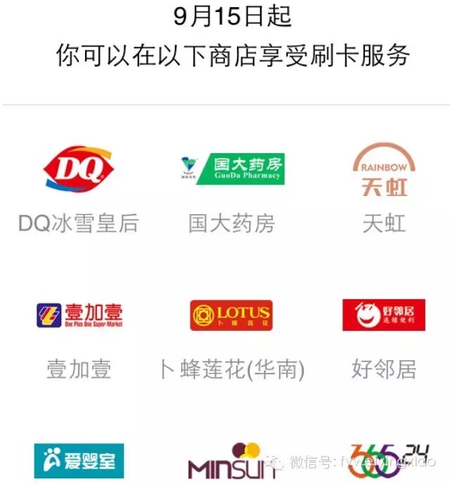 根据页面显示,从9月15日起,用户可在9家连锁商店享受刷卡服务,它们为:DQ冰雪皇后、国大药房、天虹、壹加壹、卜蜂莲花(华南)、好邻居、爱婴室、民生百货、国大365。根据方雨得到的消息,目前已经接入刷卡功能的商家已经近百家,这九家只是目前已经接入的知名度高、覆盖面较广、配合度高的连锁店,商家领域涵盖:日用百货、生活服务、药店、休闲饮食等。