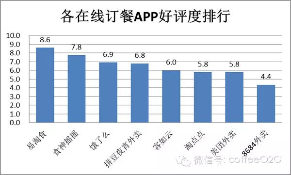 从手机APP好评度来看,易淘食虽然下载量并不高,但用户好评度却相对较高。而饿了么、拼豆夜宵外卖、美团外卖、8684外卖等评分并不乐观。此外,食神摇摇作为主要提供餐饮信息服务的APP评分和下载量都比较良好。可见,第三方平台在做低端餐饮服务的同时,应该注重餐饮质量等问题,尽量提高用户的好评度。而中高端餐饮服务类的平台在拥有良好的口碑的同时也要重视宣传,拓展受众。以易淘食举例,相比其它外卖订餐网站,易淘食重点是在做B端信息化服务,希望通过与商家的紧密联系,可以提供给消费者更好的食品。