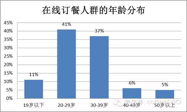 从在线订餐的人群年龄分布上来看,人群主要集中在20-39岁之间,占全部在线订餐人数的78%,其中20-29岁人群占41%,30-39岁人群占 37%。19岁以下和40岁以上的的订餐人数各占11%。这对于从事在线餐饮行业的人来说,如何能够更多的取悦于20-39岁这部分人群,是在线餐饮取得 较大成功的一个当务之急。