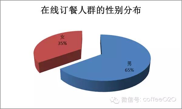 在线订餐人群的性别分布中,男性占65%,女性占35%,其中的包括男性网民人数多、基数大,男性对于餐饮的地点等要求相对较低等原因。