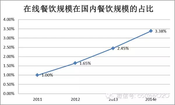 从上图在线餐饮规模在国内餐饮规模的占比走势可以看出,在线餐饮规模占比稳步增长。从2011年占比只有1%,到了2014年底预计这一比例可达3.38%。同时也意味着国内在线餐饮行业存在着巨大潜力。