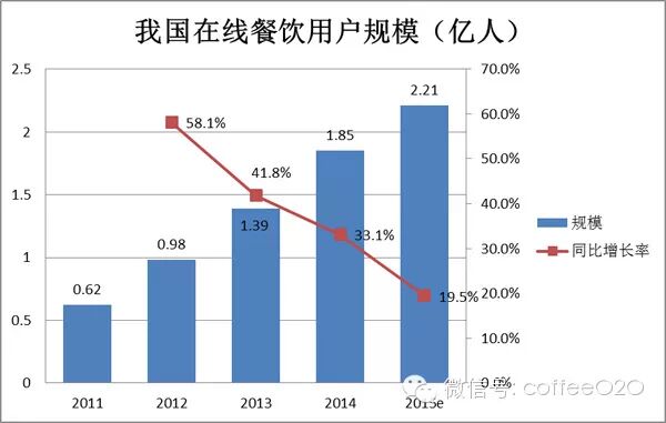 我国在线餐饮用户的规模也在快速增长中,2011年的0.62亿人到2014年增长到了1.85亿人,增长率高达198.4%!而预计到2015年我国在线餐饮用户人数能够达到2.21亿人!足见我国在线餐饮市场潜在的庞大的用户需求。